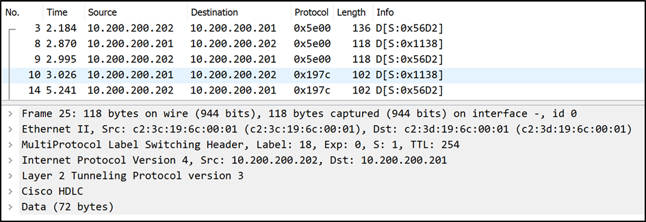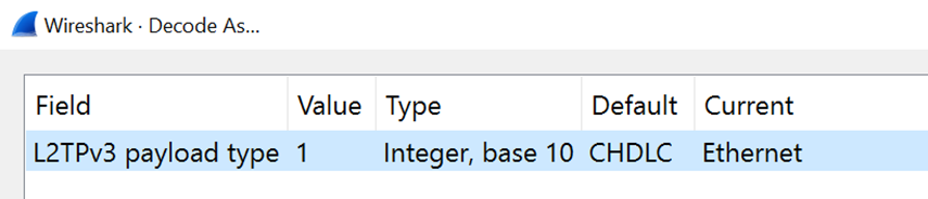 این تونل نتیجه اتصال VPLS است که در آزمایشگاه روتر خود پیکربندی کرده بودم. VPLS یک فناوری است که می تواند یک پیوند اترنت بین دو سایت ایجاد کند. هنگامی که به Wireshark برای رمزگشایی بخش داده به عنوان اترنت دستور می دهیم ، پشته کامل پروتکل آشکار خواهد شد: در آخرین قسمت رمزگشایی پروتکل در جایی که می گوید "Data (72 بایت)" کلیک راست کرده و Decode As…