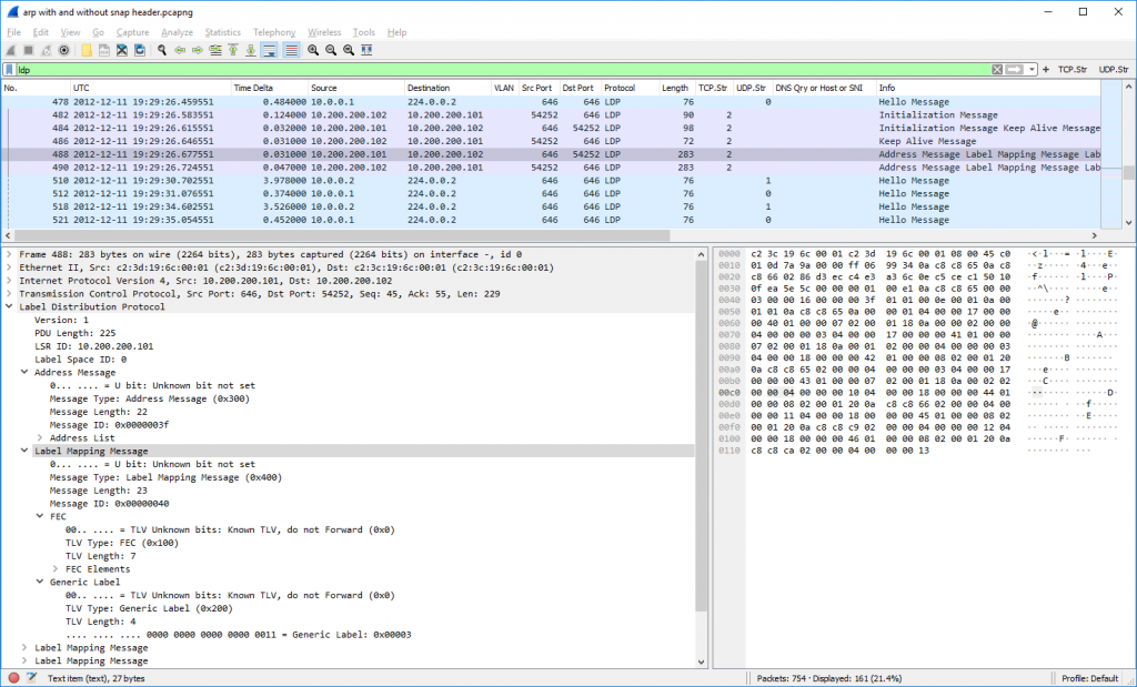 LDP مخفف Label Distribution Protocol است. ممکن است حدس بزنید که این مورد بین روترهای مجهز به MPLS استفاده می شود تا نحوه راه اندازی بسته های مشخص شده با برچسب را به انتهای راه دور اطلاع دهد. علاوه بر بسته های "سلام" ، مقداردهی اولیه ، زنده نگه داشتن و به ویژه بسته های "Label Mapping Message" وجود دارد. LDP روی پورت UDP 646 (کشف) و TCP پورت 646 (جلسه) اجرا می شود. مثل همیشه ، شما می توانید از "ldp" به عنوان فیلتر نمایشگر استفاده کنید که فقط بسته های LDP را نشان می دهد. در صورتی که به کل جلسه TCP علاقه مند هستید ، باید از "tcp.port eq 646" یا موارد مشابه استفاده کنید. تصویر زیر فقط بسته های LDP بدون سربار TCP را نشان می دهد: