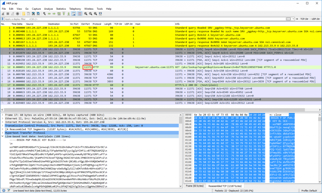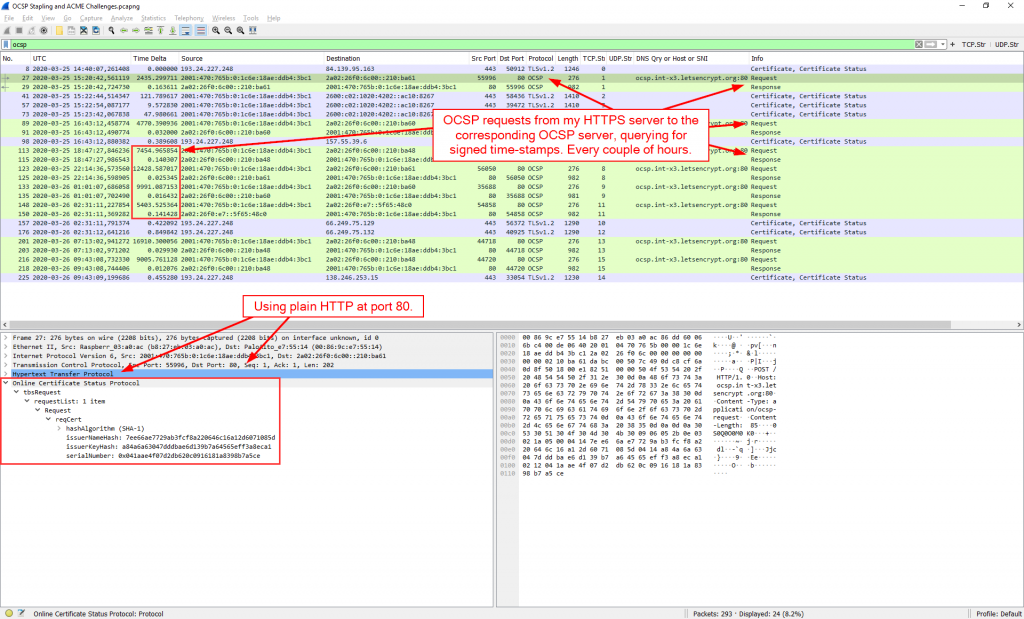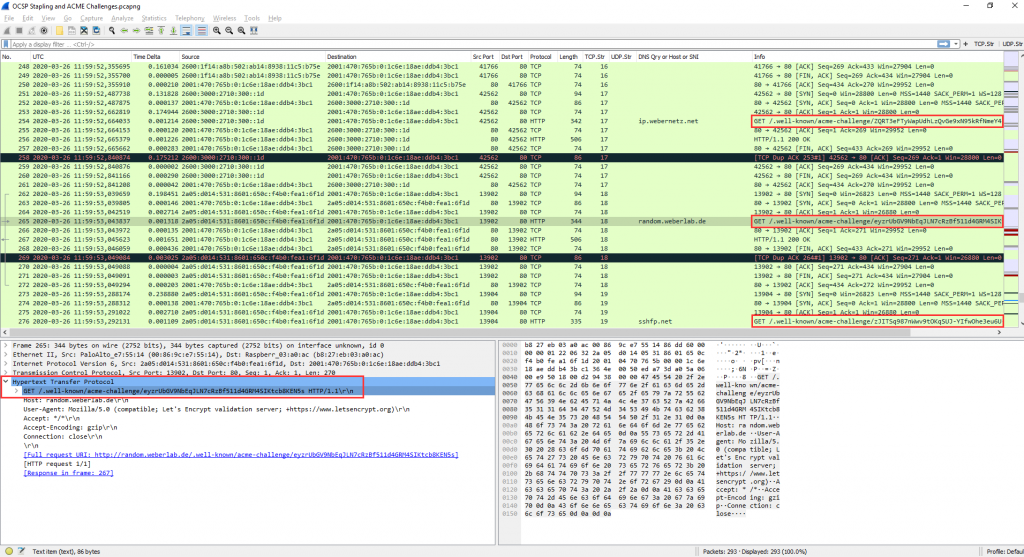 با استفاده از فیلتر نمایشگر "ocsp" هر دو نوع را پیدا خواهید کرد. توجه داشته باشید که این کل اتصالات TCP / TLS را نشان نمی دهد ، بلکه فقط قطعات OCSP را نشان می دهد. علاوه بر این ، توجه داشته باشید که وضعیت گواهی منگنه شده در اتصال TLS پروتکل OCSP نیست ، بلکه فقط یک لایه ضبط TLS است. ![]() ![]() ACME Challengeخوب ، این پروتکل شبکه خود نیست اما از HTTP برای چالش استفاده می کند. از این رو جدا کننده Wireshark یا موارد مشابه دیگری ندارد. چالش های پروتکل HTTP-01 Automatic Certificate Management Environment (ACME) با متن ساده HTTP در پورت 80 است. من آنها را در یک بسته ضبط شده در Raspberry Pi پیدا کردم که میزبان random.weberlab.de و ip.webernetz.net (از جمله) . چندین جلسه کوتاه HTTP را مشاهده خواهید کرد که درخواست مسیر معروف "/.well-known/acme-challenge/cepts19459063]" را می دهد: ![]() OpenPGP HTTP Keyserver Protocol (HKP) [19659003] پروتکل سرور کلید HKP برای انتقال کلیدهای OpenPGP به / از یک سرور استفاده می شود. من از آن در پلاگین Enigmail خود برای Thunderbird استفاده می کنم. در واقع ، این یک پروتکل واقعی نیست اما HTTP روی پورت 11371 است. حتی مقاله ویکی پدیا (تا سال 2020) و نه جدا کننده Wireshark اختصاصی ندارد. ؛) Wireshark آن را به عنوان HTTP لیست می کند: