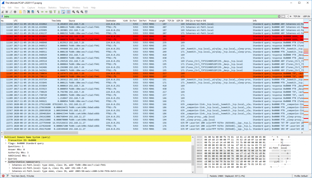 با فیلتر نمایشگر پیدا کنید: ![]() mDNSهه ، خنده دار ، من حتی نمی دانستم که بسته های mDNS را در ردیابی خود دارم تا اینکه به طور تصادفی به آن برخورد کردم. ؛) AFAIK همه آنها توسط دستگاه های اپل در طول ضبط های من برای AirPlay و AirPrint تهیه شده اند. ترافیک قدیمی IP و IPv6 ، منبع و مقصد بندر UDP 5353: ![]() متفرقه: منفی دلتا تایمزاین پروتکل نیست ، بلکه یک مشاهده عجیب در Wireshark است: زمان دلتا منفی. چی؟ چطور؟ به اتصالات بین: