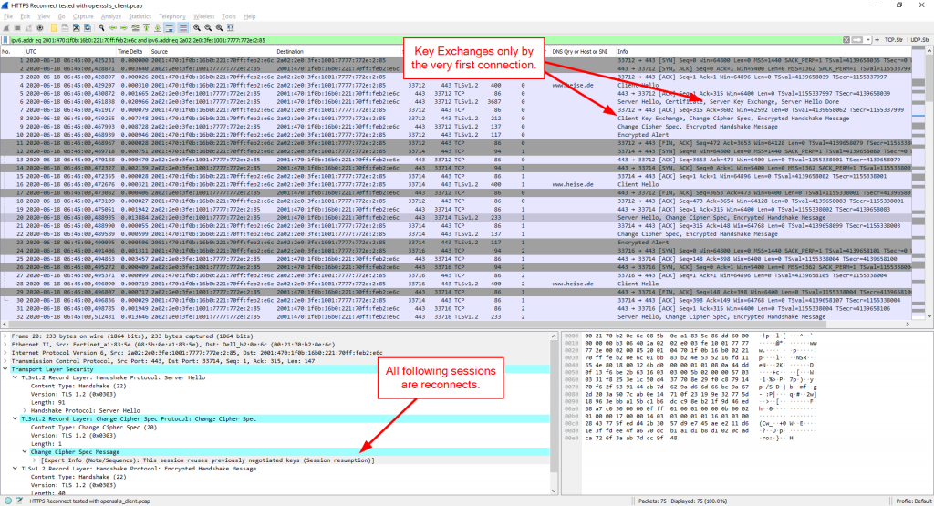 ![]() هنگام دنبال کردن جریان TCP- یا HTTP ، می توانید انتقال کلید عمومی OpenPGP را مشاهده کنید: ![]() HTTPS اتصال مجدد / از سرگیری جلسهمجدداً ، این در واقع یک پروتکل اختصاصی نیست ، بلکه یک واریانس کوچک در نحوه استفاده HTTPS با نام مستعار TLS است: با از سرگیری جلسه. آزمایش شده با: