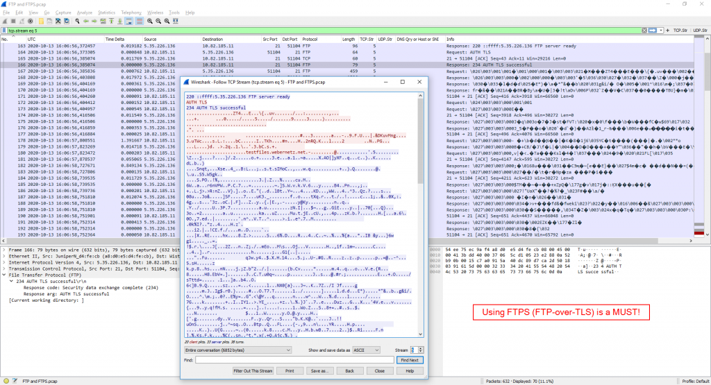 ip.addr eq 10.82.185.11 و ip.addr eq 5.35.226.136 – یکی از طریق FTP رمزگذاری نشده (بله ، می توانید رمز عبور و کل پرونده منتقل شده را ببینید!) ، و دیگری با TLS. من از FileZilla نسخه 3.50.0 استفاده کردم. - یک جلسه IPv6 از یک کامپیوتر ویندوز 7 با استفاده از فایل اکسپلورر ، که از FTP رمزگذاری نشده استفاده می کند. آخ. فیلتر نمایشگر: