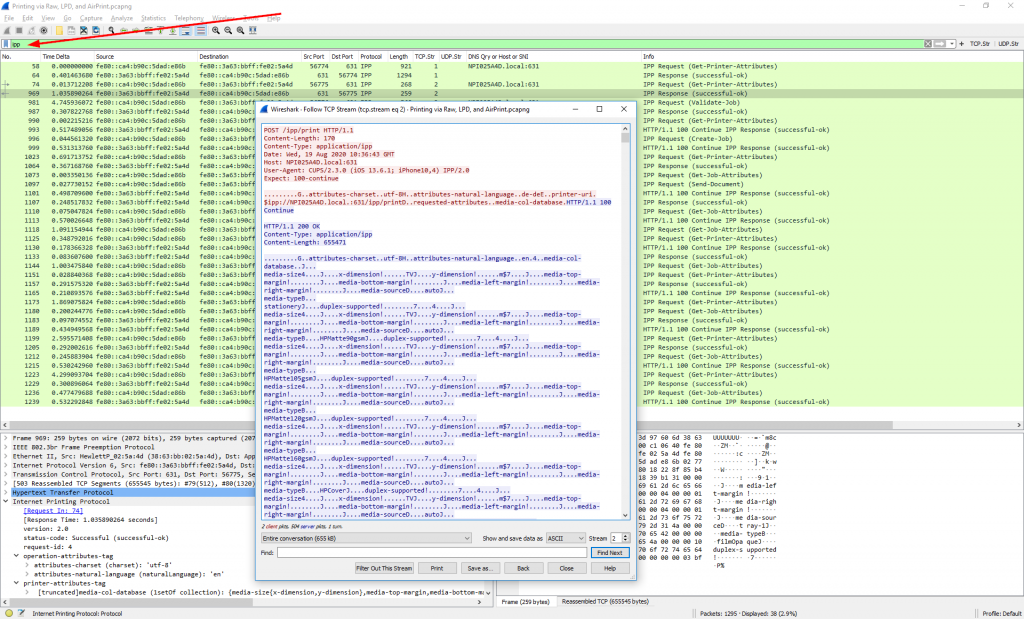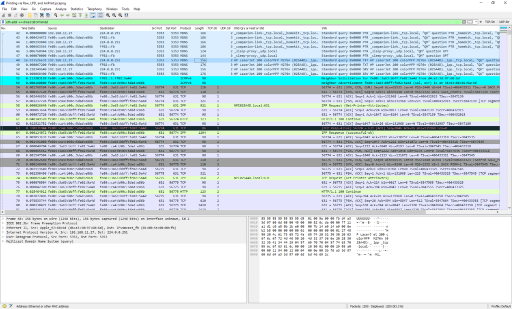 AirPrint اپل از پروتکل چاپ اینترنت IPP در TCP استفاده می کند بندر 631 (من هرگز در مورد آن چیزی نشنیده ام). در مورد من ، آیفون از طریق برخی از یافته های MDNS که در ردیابی نشان داده شده است ، چاپگر را پیدا کرده است. چاپ من از یک صفحه حدود 10 جریان TCP / UDP و تقریباً 1200 بسته طول کشید. اوه عیب یابی سخت است ، اما بدون هیچ گونه پیکربندی کار می کند. ؛) برای یافتن همه بسته های مناسب ، برای آدرس MAC آیفون فیلتر کنید: "eth.addr == d4: a3: 3d: 97: 60: 6d":