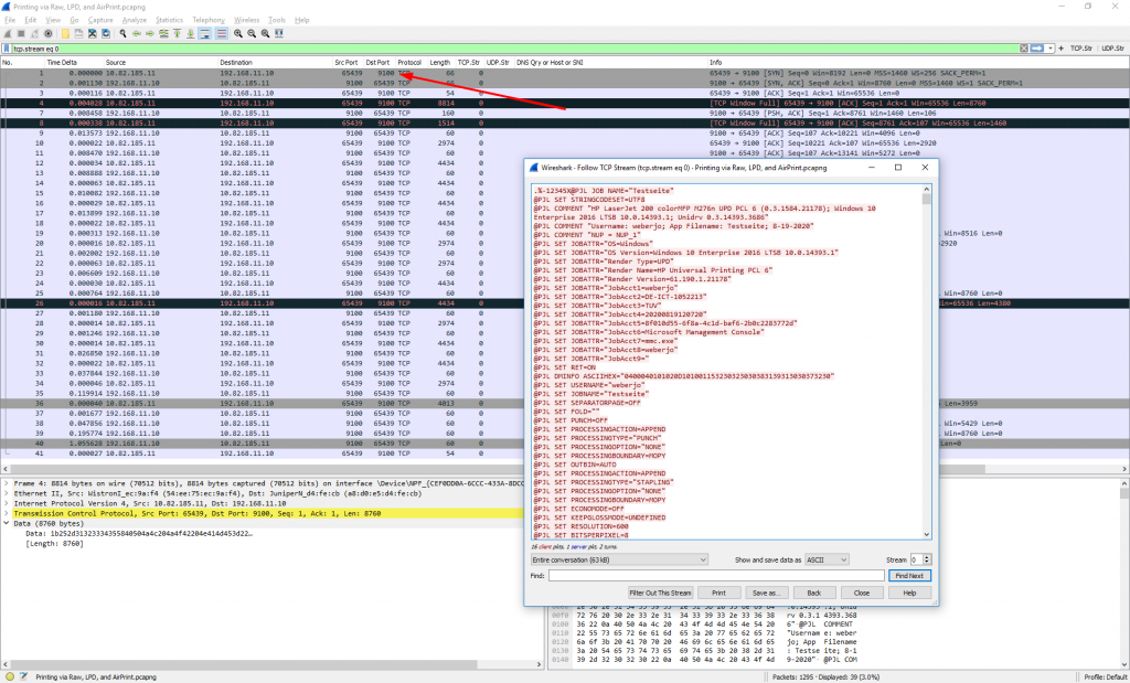 چاپ خام از طریق پورت TCP 9100 انجام می شود. HP Jetdirect یا موارد دیگر نیز نامیده می شود. Wireshark هیچ جدا کننده پروتکل برای این چاپ خام ندارد (بحث کمی اینجا ). از طریق "tcp.port eq 9100" آن را پیدا خواهید کرد: