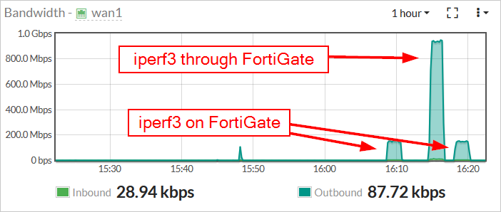 با آزمایش سرعت ISP من * از طریق * FortiGate از سیستم لینوکس پشت آن ، iperf3 حدود 900 مگابیت بر ثانیه را نشان داد ، در حالی که استفاده از پردازنده در Forti حدود 3 -5٪ در زیر ویجت پهنای باند Forti در طول آزمایشات من آورده شده است: