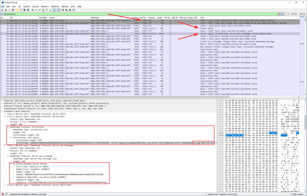 و به هر حال: این چیزی است که در Wireshark به نظر می رسد. دست دادن استاندارد TLS ، یعنی: سلام مشتری ، سلام سرور ، گواهی نامه ، تبادل کلید سرور ، مبادله کلید مشتری و غیره ، در نهایت داده های برنامه (ناخواسته از زمان رمزگذاری) به دنبال آن:
